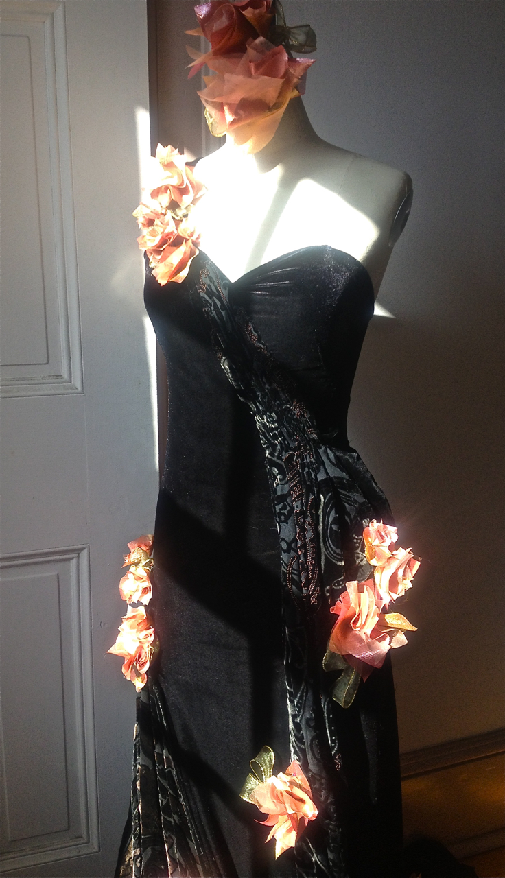 I saw the flowers on a black velvet gown with a cut silk velvet asymmetrically draped, creating subtle lines.