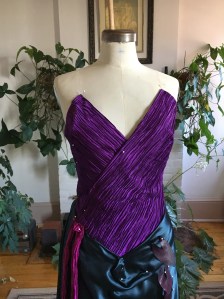I dismantled it, and draped the texture on a different angle. The bodice texture demanded a skirt to surpass it. The Art Gowns’ crinoline was pressed into service.
