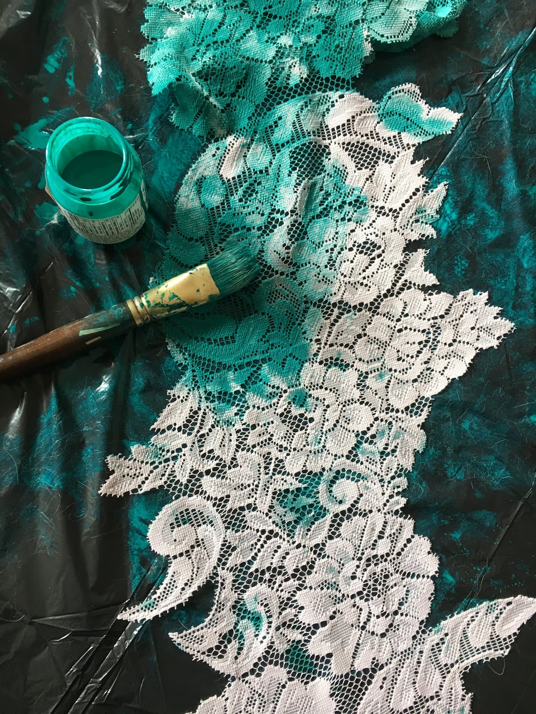 To make mock feathers, random strips were cut from a vintage curtain lace. Acrylic paint with fabric medium was daubed on irregularly. This created a visual texture. Partial ruching created volume, and a feeling of ruffled feathers.