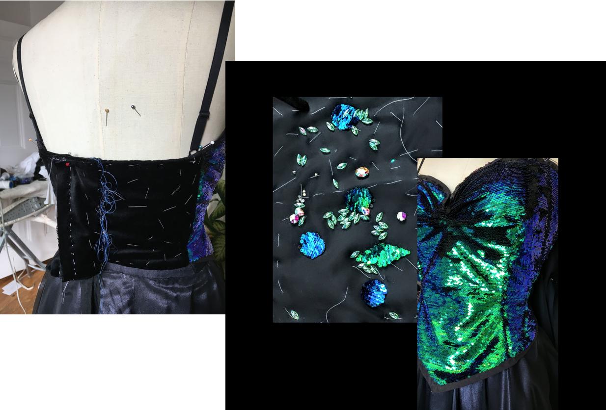 The gown can be worn with or without the bustle/nightingale tail. Teeny rhinestones (a gift from a friend) dot it and fill in between the sequin circles on the skirt’s tail.