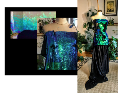 I sent Charlotte a photo of an off cut of sequin fabric someone had gifted me. It was thrown on Judy with a stretch velvet piece, to show the germ of an idea. Called “Dragon Skin”, the sequins are variegated green/blue. Also, one can rub the sequins backwards and they flip to black. Funny, but once I got going, that novelty wore off.