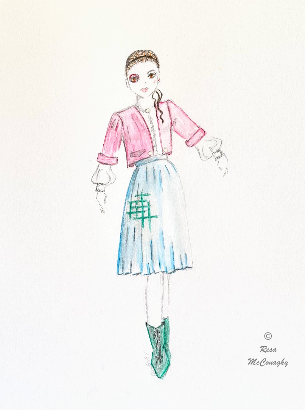 Resa – Catling has begun studying under Vianne. She is about 13 1/2. Taking bits from the book, this drawing happened. A pink jacket is mentioned earlier, boots later on. She is all prim and proper, pearl buttons and tatted lace on a white blouse.
