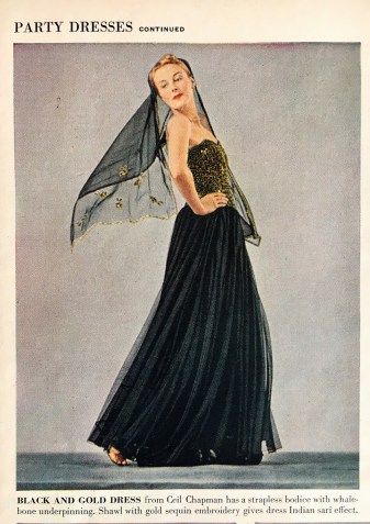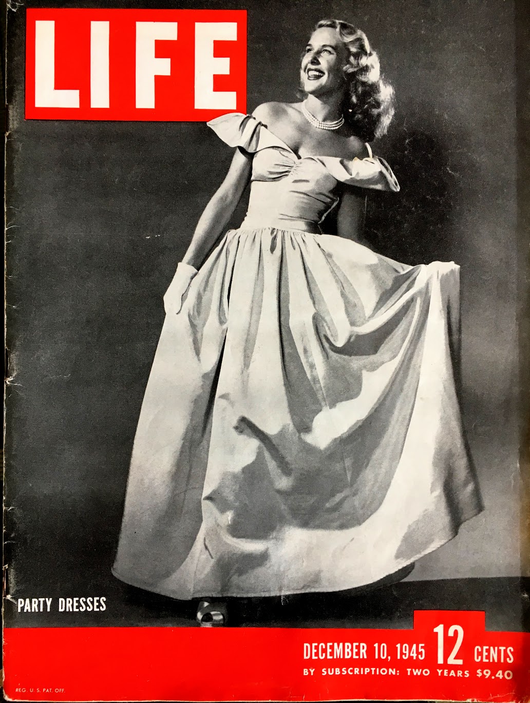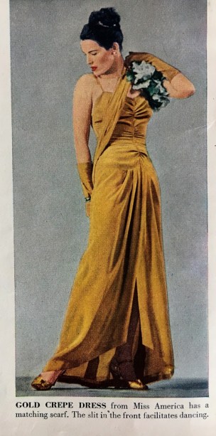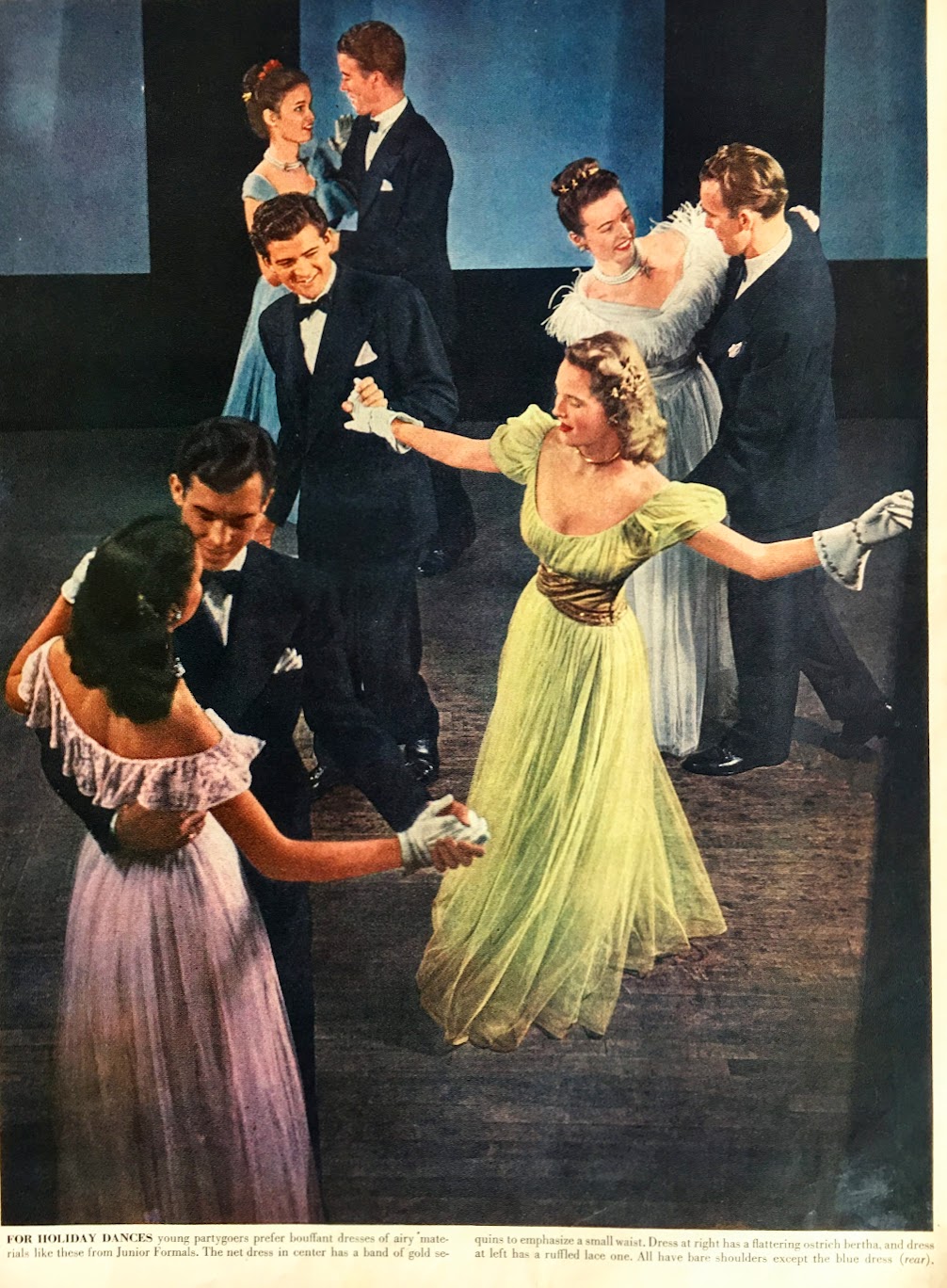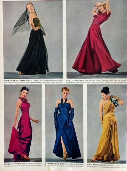 “You do have to mention the flour sack dresses of the 1930s – so it wasn’t just the war, it was the war after years of Depression. Forced frugality because of the economy which continued into the war, when doing with less was patriotic. Holiday season, 1945 – a time to celebrate, put on a gown and dance like the world is brand new again.”
