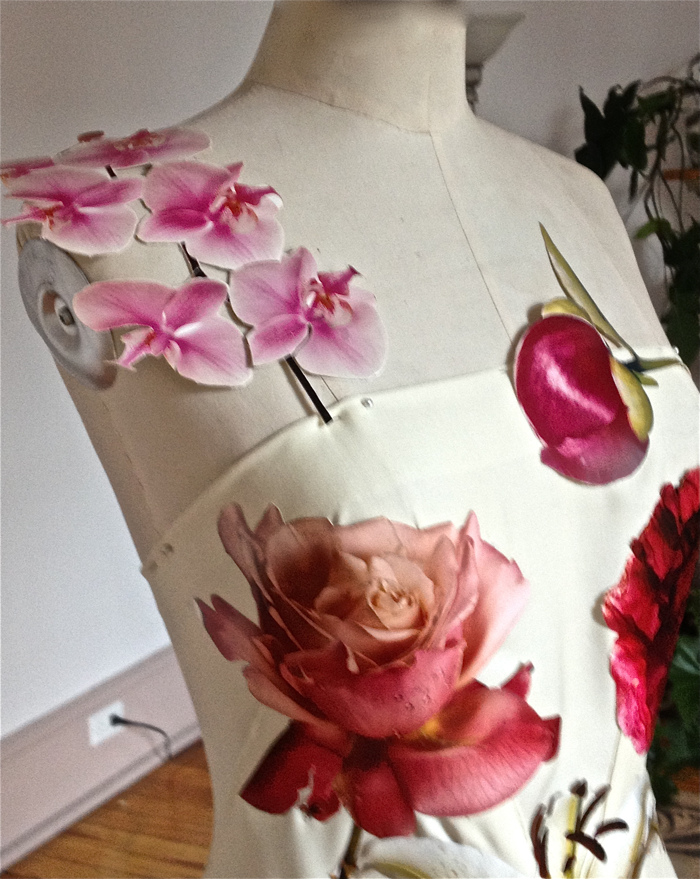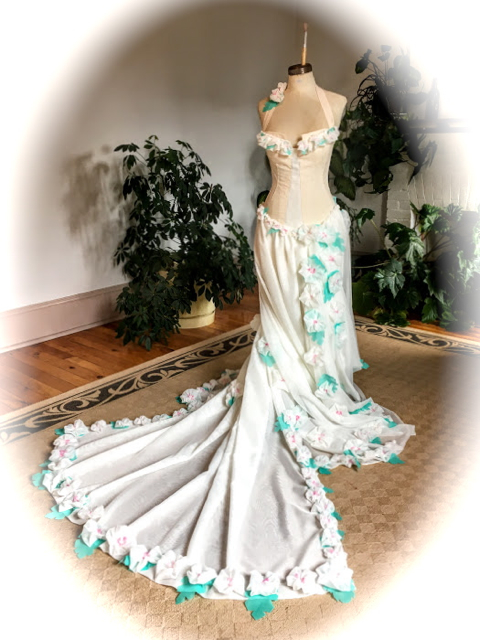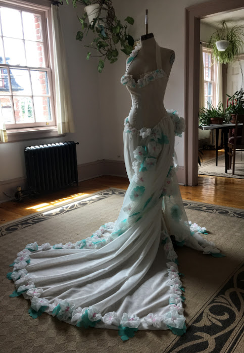 It began with an 80’s floral print fabric draped on Judy. Surrounded with acetates, a sheer and lace harvested from “Atlantis Mermaid Love-In”, inspiration struck .