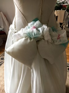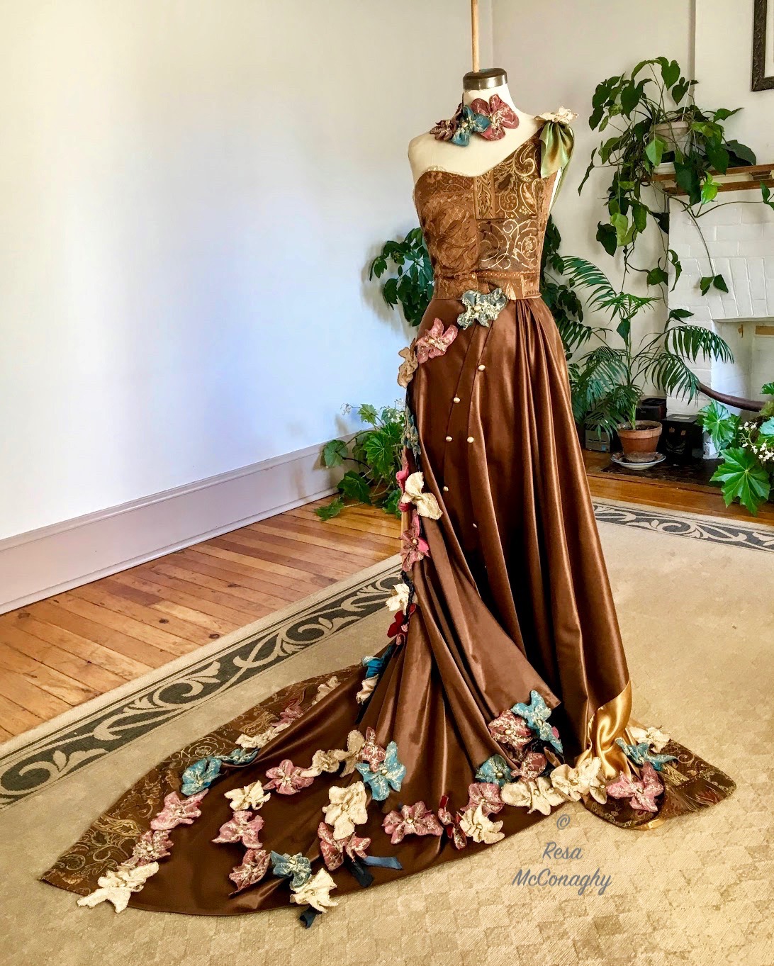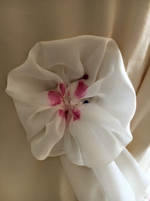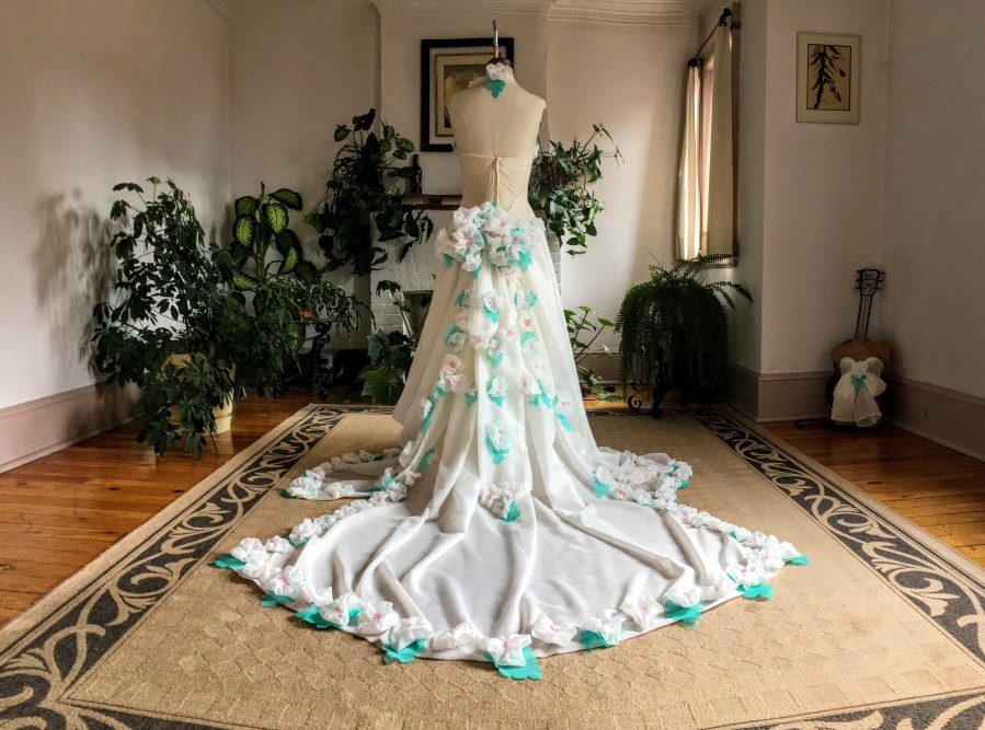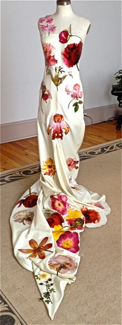 Once dry the paint was heat set, the lace cut into creative shapes and randomly gathered. The 3d lace pieces were strewn behind the gown, and it was evident backing yardage was required.
