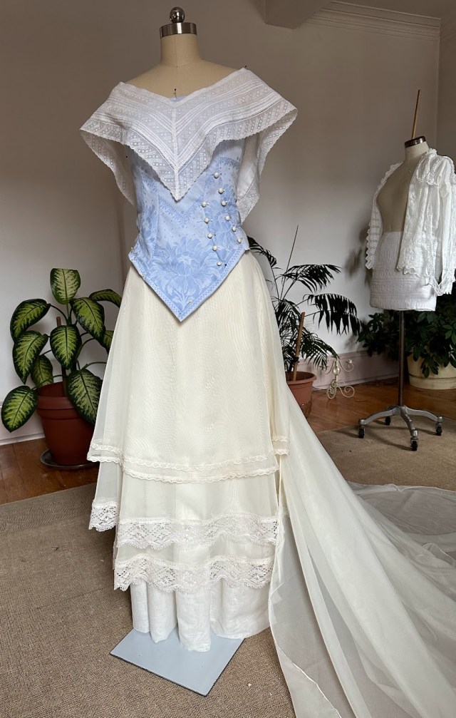 A bussel was formed from blue serviettes that matched the bodice’s tablecloth, and eyelet lace trim from the second bed jacket.