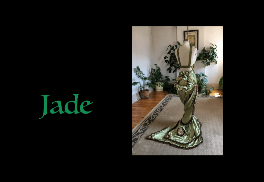 Midnight Nightingale’s circular skirt tail can be hitched up, with or without the bustle/nightingale tail, for various effects.