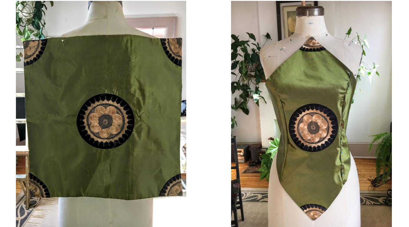 I sent Charlotte a photo of an off cut of sequin fabric someone had gifted me. It was thrown on Judy with a stretch velvet piece, to show the germ of an idea. Called “Dragon Skin”, the sequins are variegated green/blue. Also, one can rub the sequins backwards and they flip to black. Funny, but once I got going, that novelty wore off.