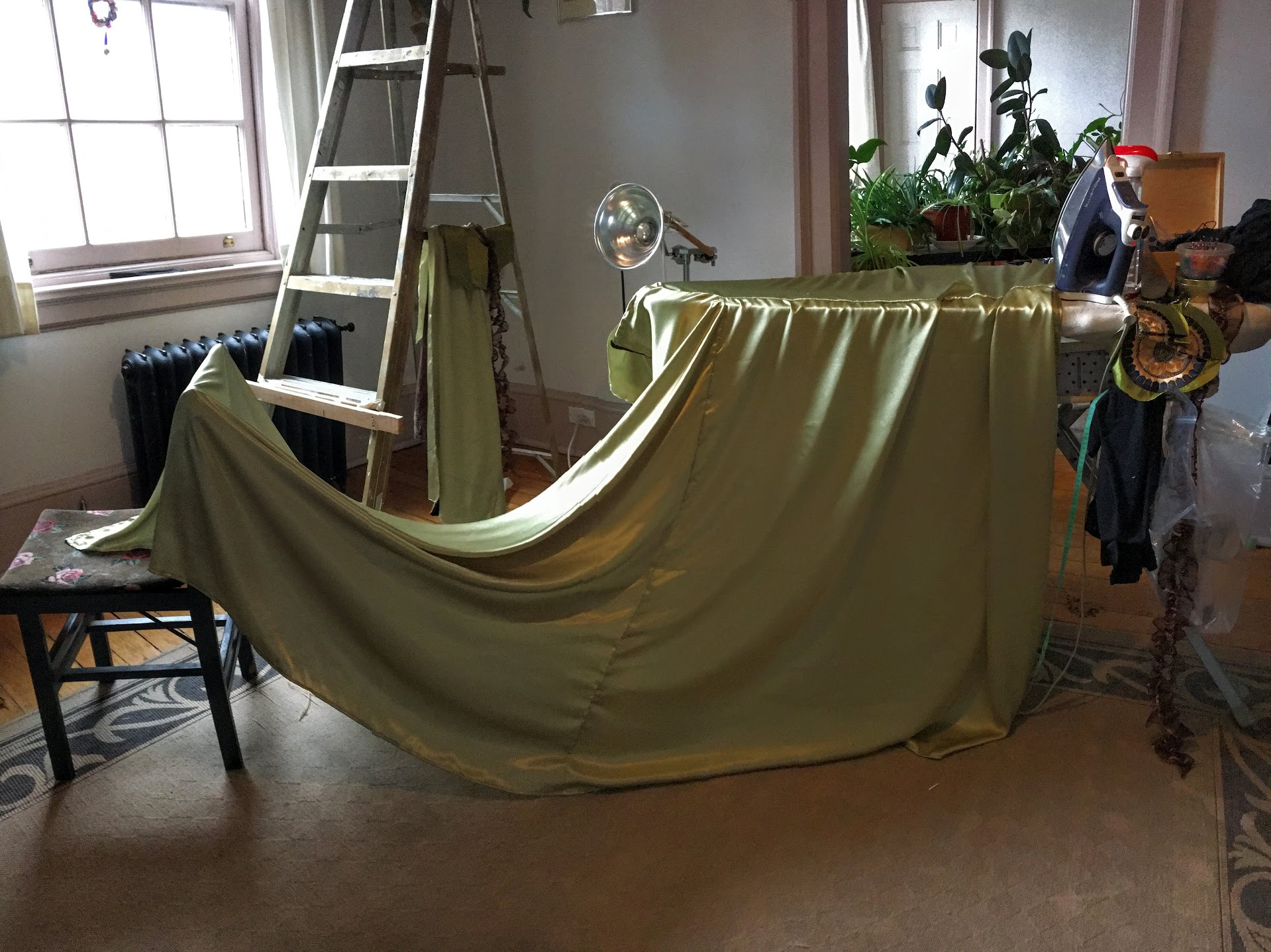 A bustier shape was draped on Judy, then transferred to a paper pattern. That was used to cut the Dragon Skin. A decent yardage of 25 year old NOS plum acetate satin was pulled from the stash, and a 3 panel a-line(ish) skirt was cut. A full circle of $2.00/yd., 120″ wide liquidated black curtain sheer was draped on top.