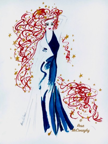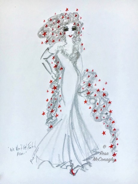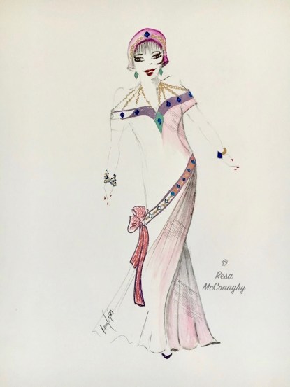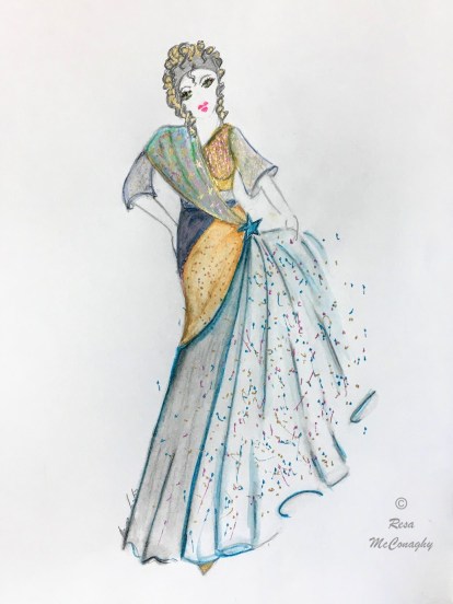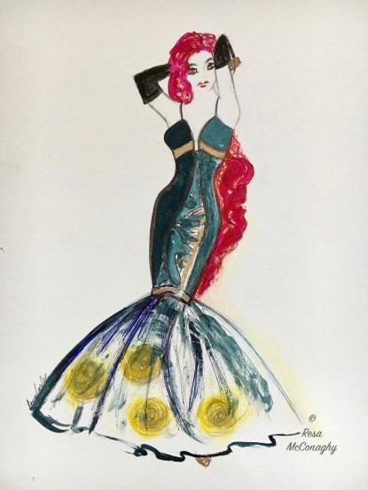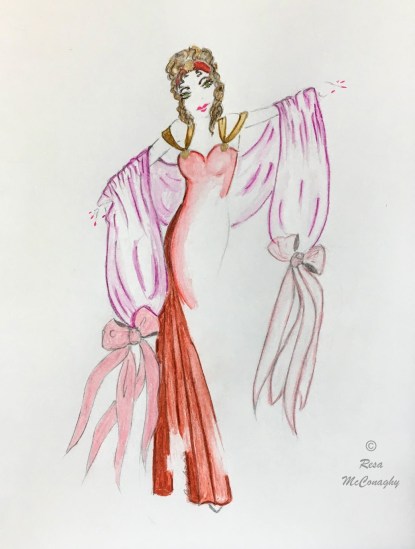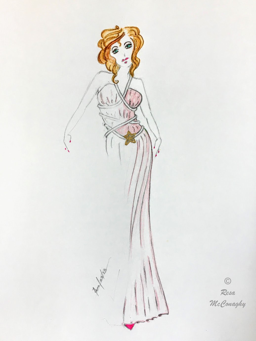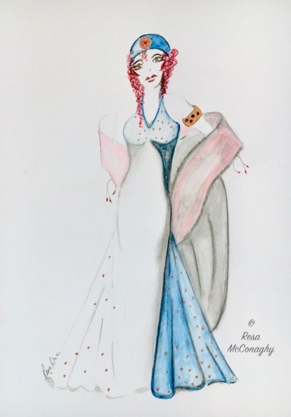 Resa – John, I’d like to post this on “Art Gowns”, but need as many gowns as possible. As you can see I have drawn Sam in: an Angel gown, a Las Vegas gown, A Roman Colosseum Gladiatorette gown, a Tea Time on the Titanic gown and a 1912 Ball gown.