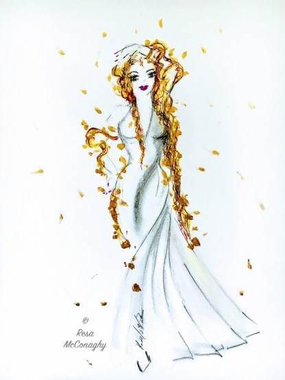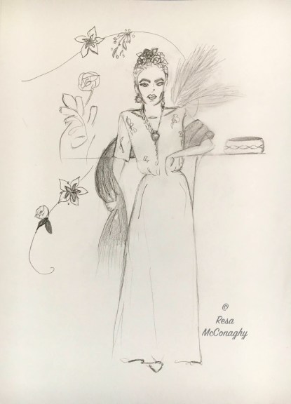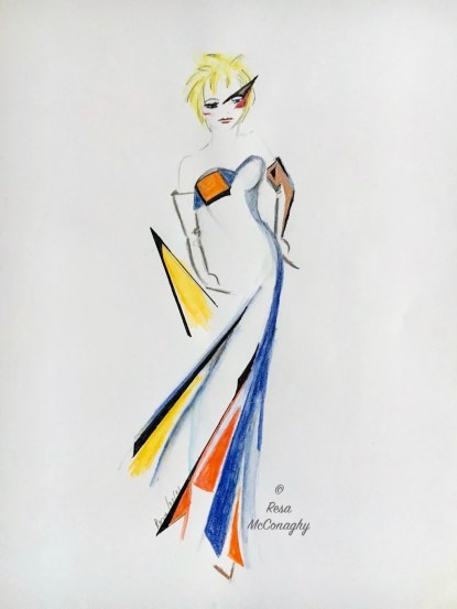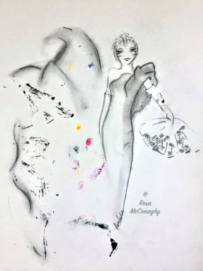 Resa – Also, now that I’m into drawing Sam, I got an itch to draw her in a mid 70’s style casino gown. Yes, I know she never wears one when they go to the Bellagio, but she could, in a time warp thing. I can’t remember if she wears one in the previous book, when they go to Vegas?