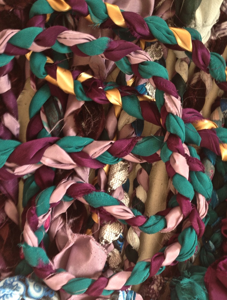 I needed some type of rope to adorn her. So, I made tubes from the satin, & braided them with tubes I made from the wrong side of a cheesy sparkly disco material.